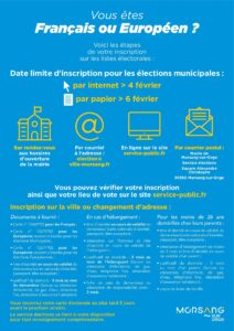 Pour pouvoir voter aux élections municipales des 15 et 22 mars, il est nécessaire de vous inscrire sur les listes électorales. Cette inscription peut être réalisée en ligne jusqu’au 4 février, ou en mairie jusqu'au 6 février.