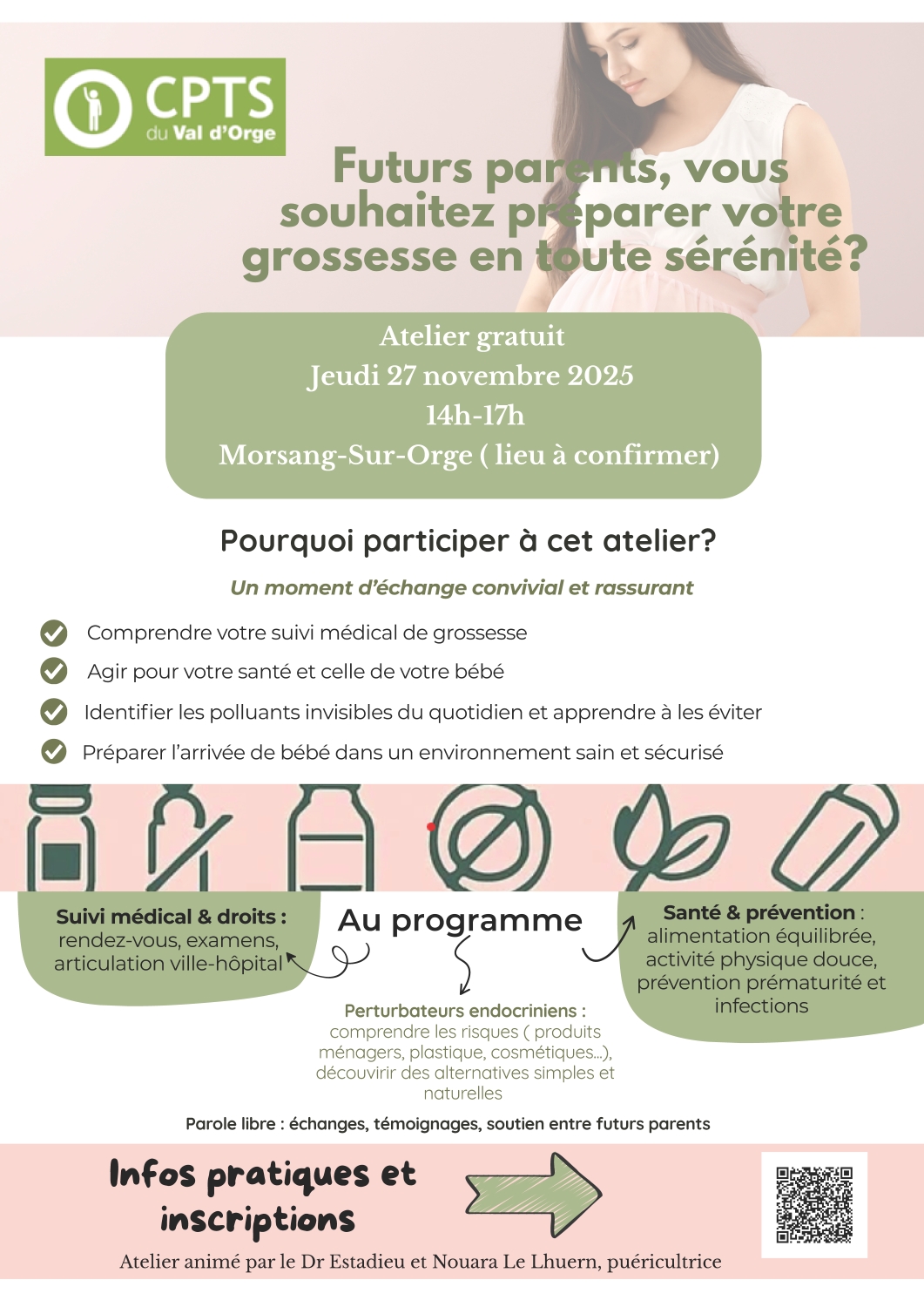 La CPTS du Val d’Orge a le plaisir d’inviter les femmes enceintes et les futurs co-parents à participer à un atelier gratuit consacré à la grossesse et à la santé maternelle le jeudi 27 novembre 2025, de 14h à 17h, à Morsang-sur-Orge (l’adresse exacte sera transmise après inscription).