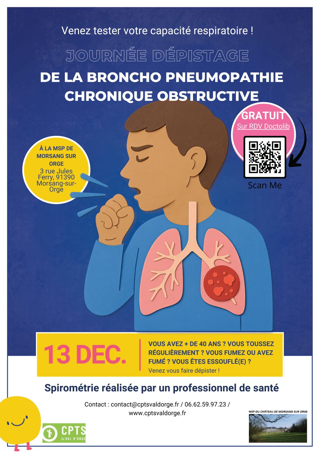La CPTS Val d’Orge organise une matinée dépistage de la Broncho Pneumopathie Chronique Obstructive (BPCO) le samedi 13 décembre de 8h30 à 12h, à la Maison de Santé Pluriprofessionnelle de Morsang sur Orge (3 rue Jules Ferry).