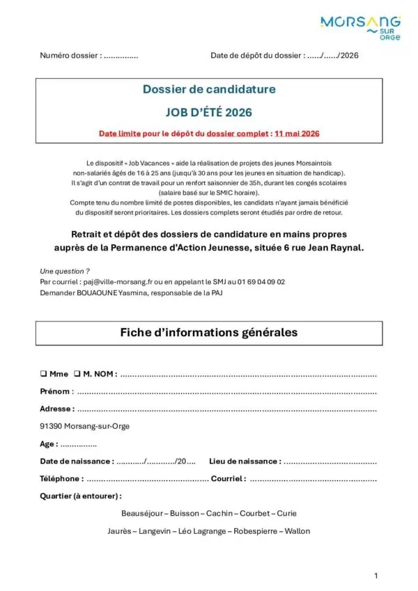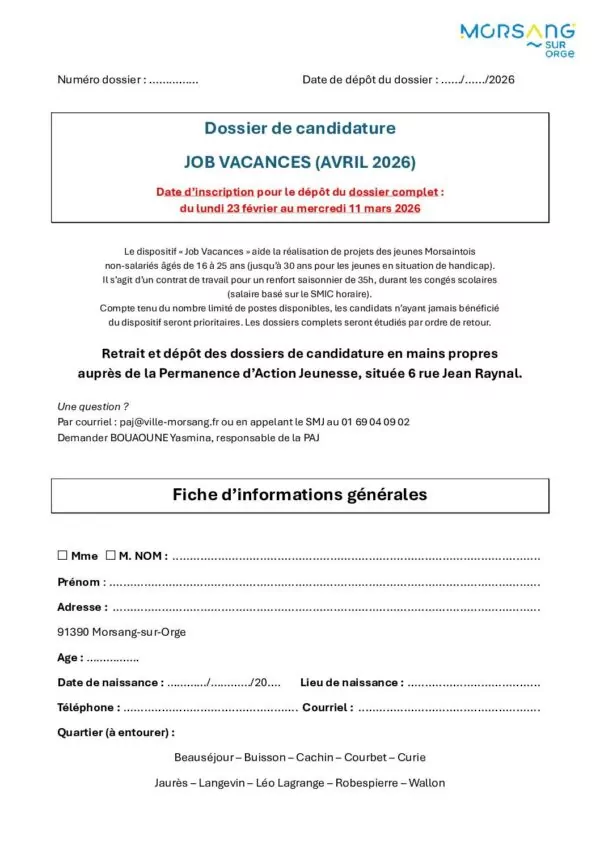 Retrait et dépôt des dossiers (en mains propres) : Permanence d’Action Jeunesse, 6 rue Jean Raynal