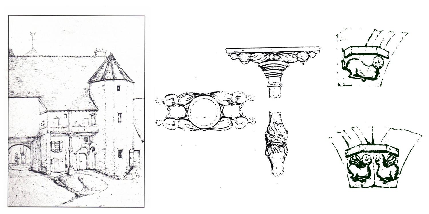 « Il en reste la voûte d’entrée et un escalier à vis dans une tourelle hexagonale conduisant à une galerie que soutient en son milieu une poutre curieusement sculptée » (Monographie de 1899 par Maurice Binant).